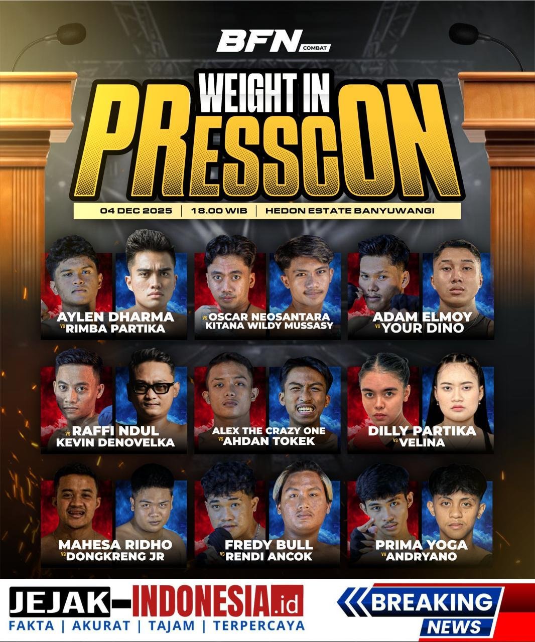 BANYUWANGI || jejakindonesia.id – Gelaran Banyuwangi Fight Night (BFN) Combat Series 2 kembali hadir pada Sabtu, 6 Desember 2025, di Stadion Diponegoro Banyuwangi. Event ini bakal mempertemukan para petarung amatir dari berbagai kalangan, sekaligus menjadi panggung pembuktian transformasi generasi muda Banyuwangi melalui olahraga bela diri.