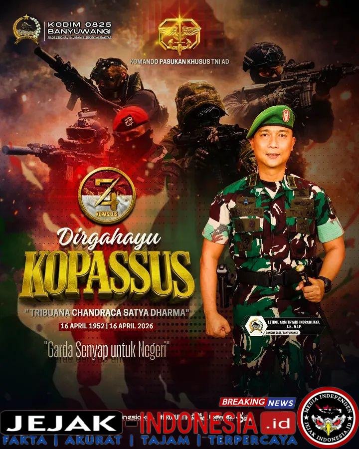 BANYUWANGI || Jejak-indonesia.id – Momentum peringatan Hari Ulang Tahun ke-74 Komando Pasukan Khusus menjadi refleksi penting atas dedikasi panjang pasukan elite TNI Angkatan Darat dalam menjaga kedaulatan bangsa. Komandan Kodim (Dandim) 0825/Banyuwangi, Letkol Arm Tryadi Indrawijaya, S.H., M.I.P., bersama staf dan jajaran, turut menyampaikan ucapan selamat dan penghormatan atas kiprah Kopassus yang telah mengabdi sejak 16 April 1952.