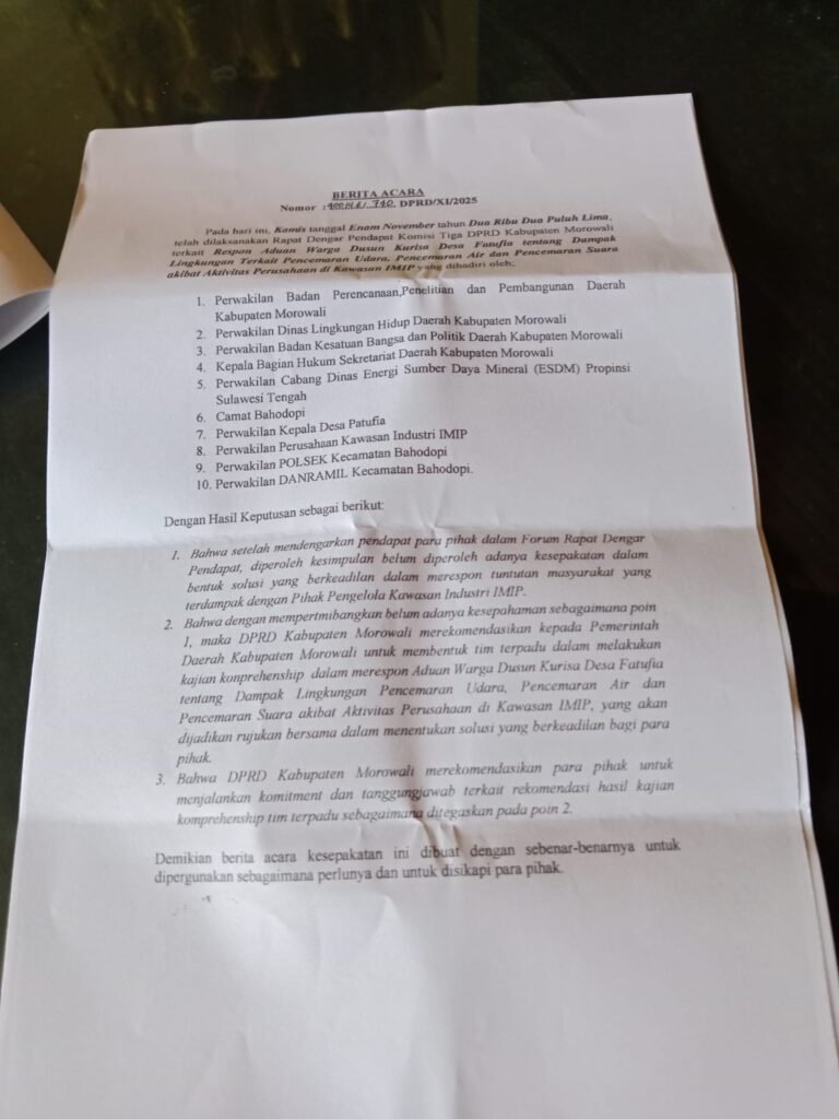 Morowali || jejakindonesia.id – Warga dusun Kurisa, Desa Fatufia, Kecamatan Bahodopi, Kabupaten Morowali, Propinsi Sulawesi Tengah mengadu ke Dewan Perwakilan Rakyat Daerah (DPRD) Morowali terkait dugaan pencemaran lingkungan yang dilakukan oleh PT. Indonesia Morowali Industrial Park (IMIP).
