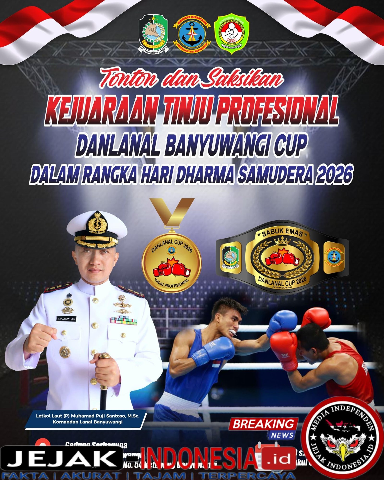 BANYUWANGI || Jejak-indonesia.id – Dalam rangka memperingati Hari Dharma Samudera, Pangkalan TNI Angkatan Laut (Lanal) Banyuwangi menggelar Kejuaraan Tinju Profesional “Piala Danlanal Banyuwangi Cup 2026” yang akan berlangsung pada 10 hingga 12 Februari 2026.