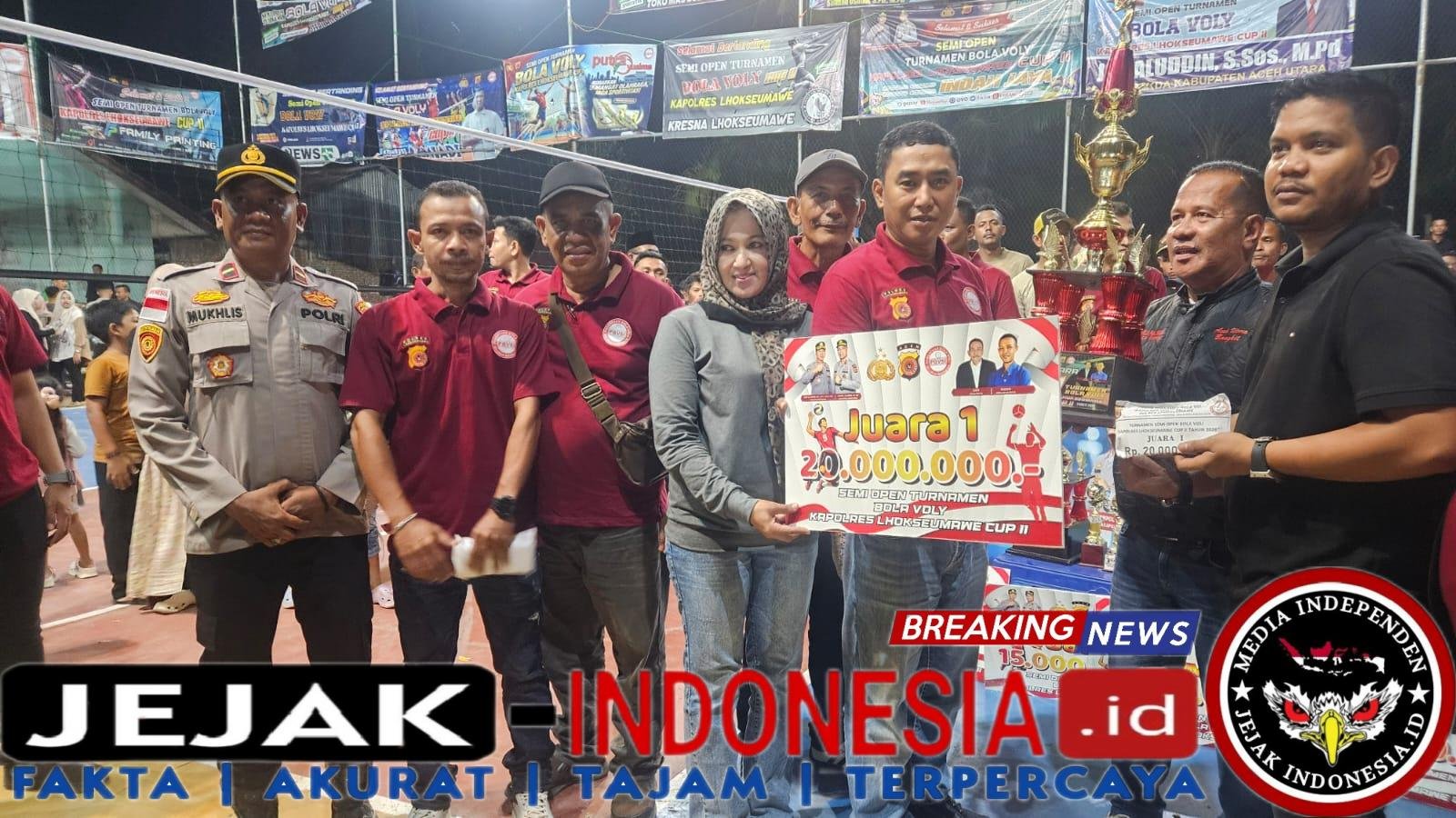 LHOKSEUMAWE || Jejak-indonesia.id – Turnamen Bola Voli Semi Open Piala Kapolres Lhokseumawe Cup II Tahun 2026 resmi ditutup dalam suasana meriah dan penuh sportivitas di lapangan voli Desa Tanjong, Kecamatan Meurah Mulia, Kabupaten Aceh Utara, Minggu (19/4/2026) malam.
