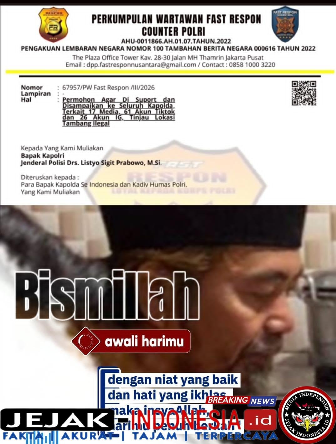 JAKARTA || Jejak-indonesia.id – Ketua Umum Persatuan Wartawan Fast Respon Nusantara (PW-FRN), Agus Flores, akhirnya melayangkan surat resmi kepada Kapolri terkait dugaan carut-marutnya penegakan hukum terhadap praktik tambang ilegal di Indonesia.