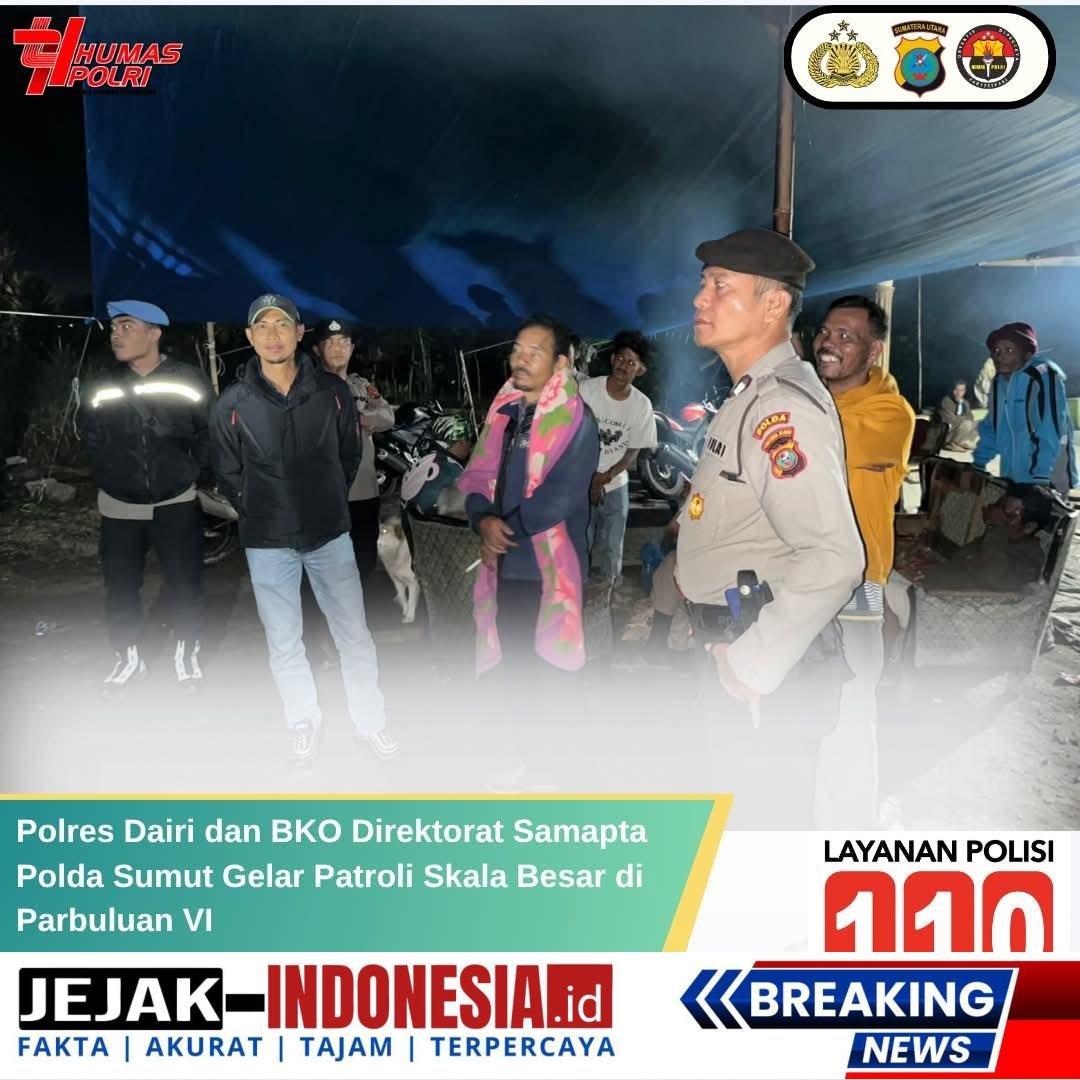 DAIRI || jejakindonesia.id – Personel Polres Dairi bersama Personel BKO Direktorat Samapta Polda Sumatera Utara melaksanakan kegiatan pengamanan dan patroli skala besar di Desa Parbuluan VI, Kecamatan Parbuluan, Kabupaten Dairi, pada Jumat malam (14/11/2025).