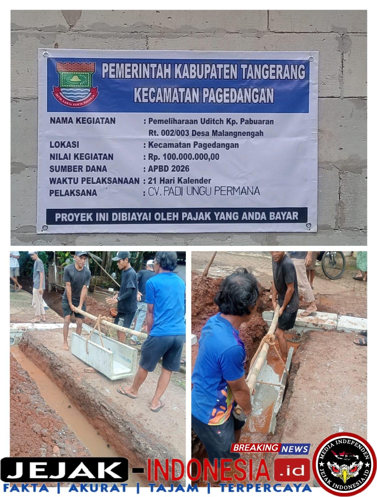 TANGGERANG || Jejak-indonesia.id – Proyek pembangunan saluran air U-Ditch di Desa Malang Nengah, Pagedangan, Tangerang, dengan anggaran Rp 100 juta, diduga tidak sesuai standar teknis. Pekerjaan terkesan asal-asalan, dasar pemasangan tidak dialasi pasir, dan susunan U-Ditch tidak rata.