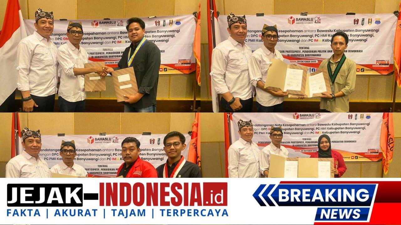 BANYUWANGI || jejakindonesia.id – Badan Pengawas Pemilu (Bawaslu) Kota Banyuwangi, Senin (20/7/25) melakukan penandatanganan Memorandum Of Under Standing (MoU) dengan Organisasi Kemasyarakatan Pemuda (OKP).
