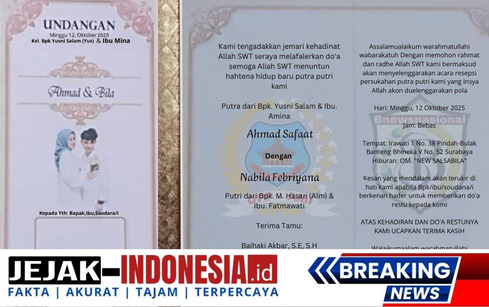 Kami, Yusni Salam, Pimpinan Redaksi dari bnewsnasional.id, bnewsjatim.id, dan Nusantarajayanews.id, beserta keluarga, dengan kerendahan hati dan penuh rasa syukur, bermaksud mengundang panjenengan untuk hadir dalam acara pernikahan putra kami (Ahmad & bila).